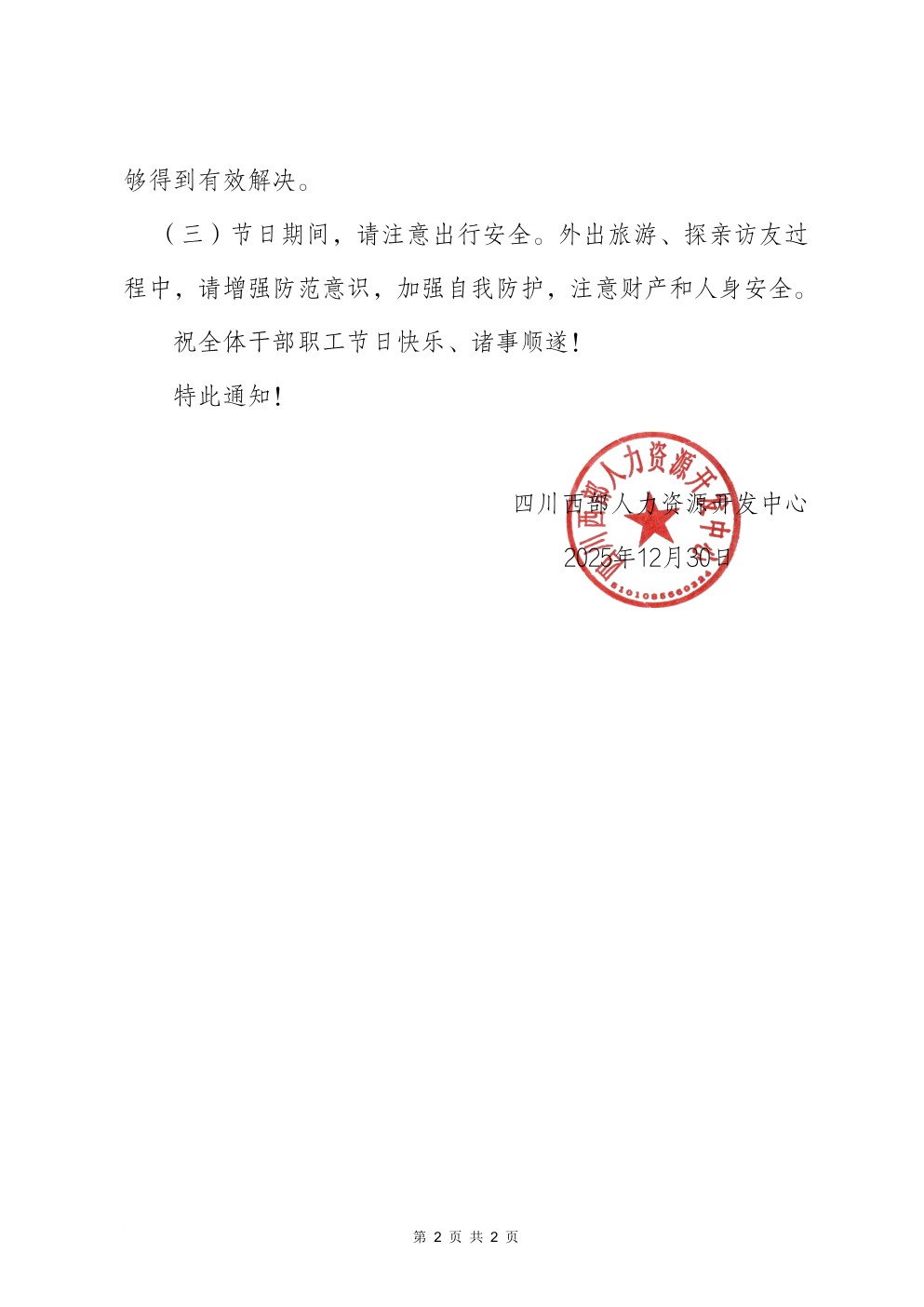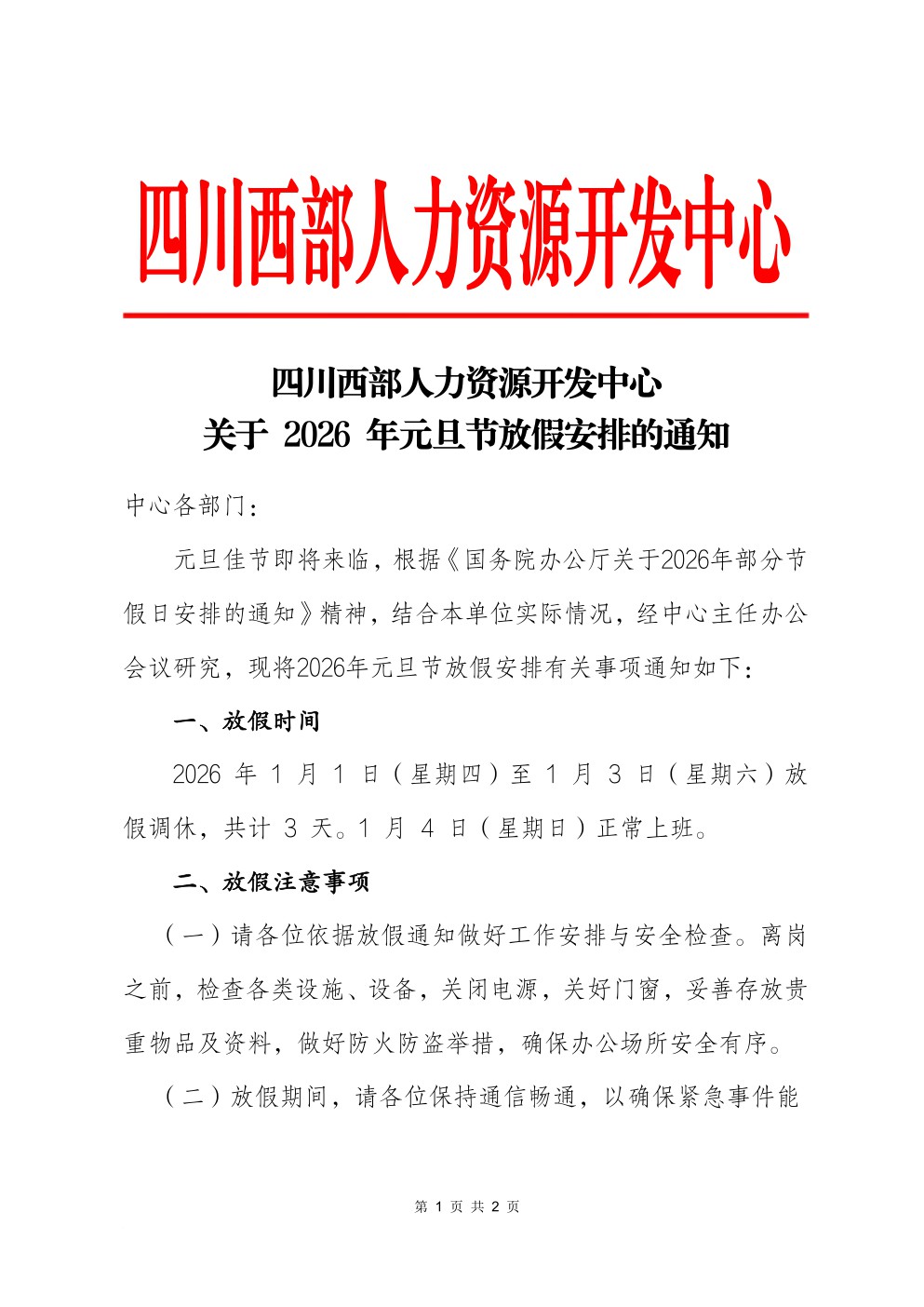 四川西部人力资源开发中心关于2026年元旦节放假安排的通知