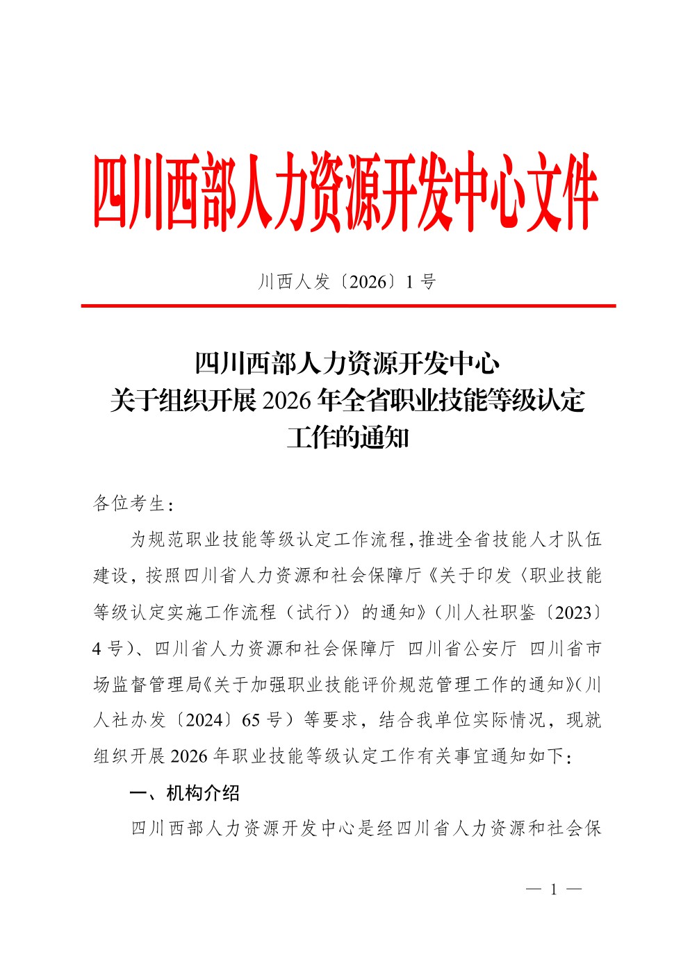 四川西部人力资源开发中心关于组织开展2026年全省职业技能等级认定工作的通知