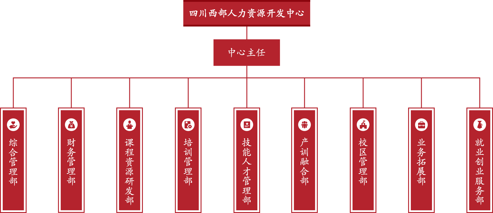 综合管理部、财务管理部、课程资源研发部、培训管理部、技能人才管理部、产训融合部、校区管理部、业务拓展部、就业创业服务部